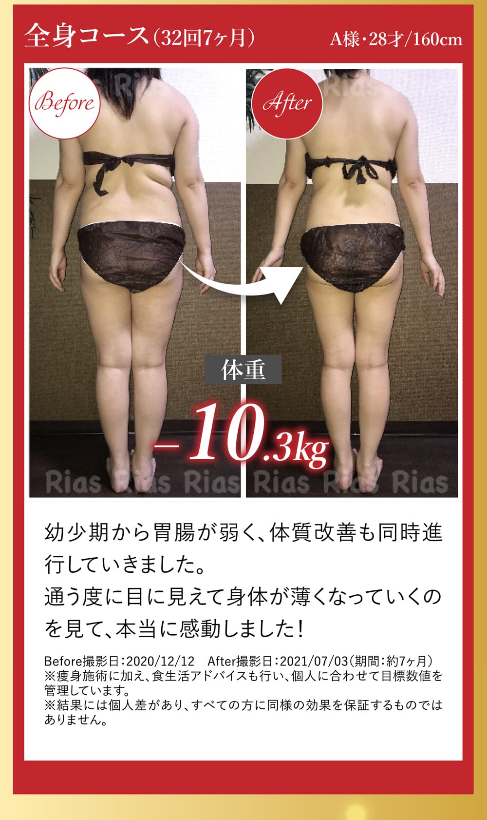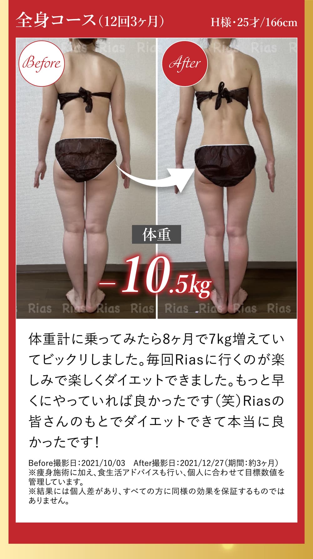 Riasの全身痩身コースでは、160cmの方で3〜4ヶ月で平均-8kg程落とされてます。